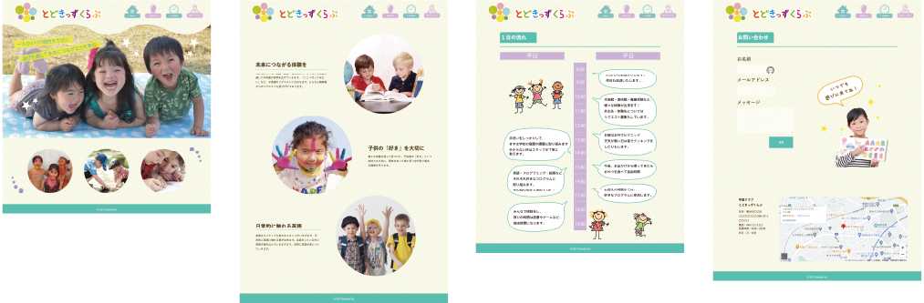 website webサイトデザイン 学童保育「とどきっずくらぶ」 <架空>https://todonaomi.site/todokidsclub/ ◯ターゲット◯制作期間◯使用ツール◯コメント 小学生の子供を持つ母親・父親 2週間 HTML / CSS / jQuery 「一人ひとりの個性を大切に」がコンセプトの学童クラブです。 「子供達が自分らしく過ごせる場所」を表すために、子供達の自然な笑顔を トップページに配置しました。 優しいイメージを出すために、柔らかい色合いにしました。 ◯ロゴ 花の形をイメージ。花びら1枚1枚が「個性」。 得意な事・不得意な事・好きな事・嫌いな事、全てが 人を作る大切な要素だというメッセージが込められています。 また、様々な個性を持つ人間が集まって、ひとつの花(チーム)になる、 というイメージも表しています。 様々な色・模様・大きさが「多様性」を表しています。 ◯色子供らしく、可愛い色合いにしました。 ◯グッズ展開 TOP